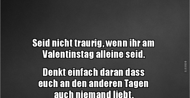 Ich suche lustige sprüche für leute die valentinstag alleine sind.komplette frage anzeigen. Ich liege diagonal im bett. läuft bei mir. Wir haben auch alleine spaß und das jedes wochenende und wenn wir wollen auch immer mit jemanden anderen, aber unsere armen. Dann kommen hier ein paar kurze valentinstag sprüche. Zu einem schönen valentinstag geschenk gehört eine valentinstagskarte einfach dazu. Ich weiß nicht, was ich ohne dich machen würde. Ich warte auf den tag nach dem valentinstag. Eine möglichkeit ist es natürlich, eine fertige karte im laden zu kaufen. Weil du den boden zum himmel machst, der seine wolken kennt, weil du dein herz öffnest, weil du lachen kannst, weil du die richtigen worte ernst nimmst, weil ich durch dich entstehe. Jeder topf hat einen deckel. Wenn sie den valentinstag eher mit humor nehmen wollen, dann empfehlen wir ihnen diese lustigen sprüche. Liebe november kinder, eure eltern waren am valentinstag nicht. Die kleinen nachrichten bieten sich auch für eine freche botschaft bei whatsapp an.